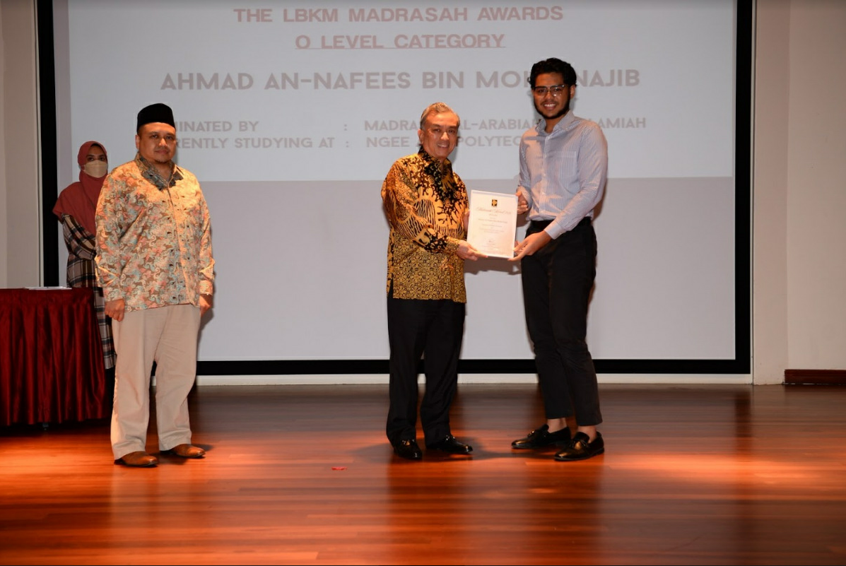 Anugerah bagi kategori GCE ‘O’ pula dimenangi Ahmad An-Nafees Mohd Najib dari Madrasah Al-Arabiah Al-Islamiah. Dia membawa pulang hadiah S$1,000 sebagai hadiah Anugerah Madrasah LBLM GCE ‘O’.