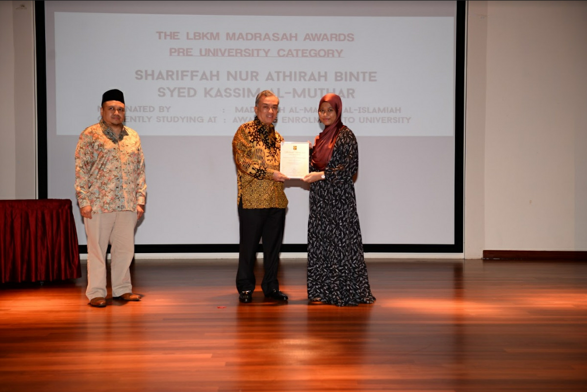 Anugerah Madrasah LBKM bagi peringkat GCE ‘A’ pula jatuh ke tangan Shariffah Nur Athirah Syed Kassim dari Madrasah Al-Ma’arif Al-Islamiah yang menerima hadiah S$1,500.